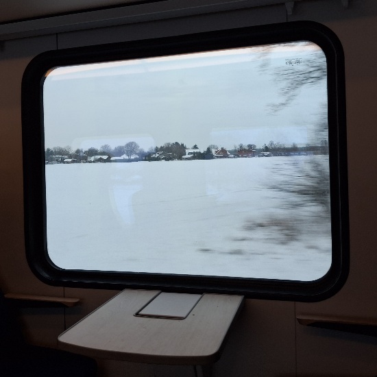 De trein Bremerhaven - Bremen rijdt netjes op tijd. Onderweg zien we het mooie witte landschap, maar de stations in Duitsland worden heel goed sneeuw vrij gehouden.