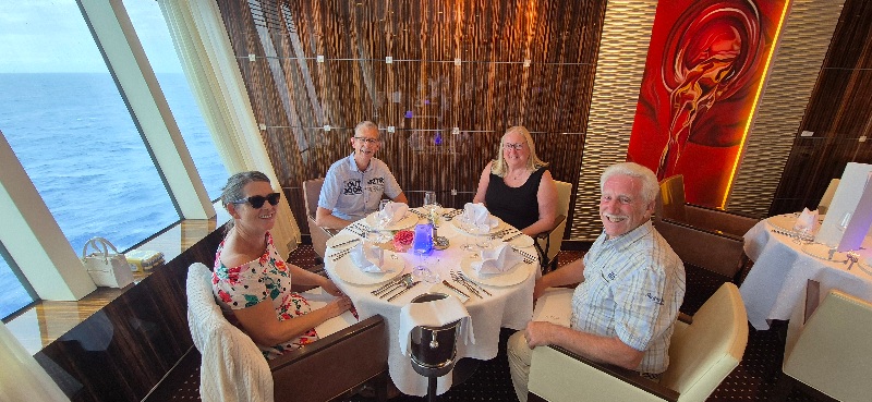 Samen met Dieter en Krista, die we bij de danslessen hebben leren kennen, van een 6 gangen menu genoten bij het restaurant Rossini aan boord.