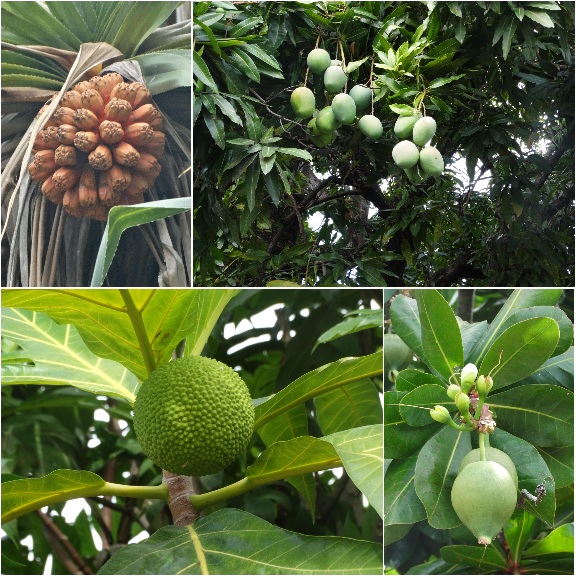 Meestal zie je een klein huisje in een grote tuin met vruchtenbomen, zoals mango, uru en nori.