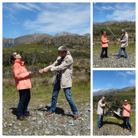 De gids had een vlag van Rohan en ook film wapens meegebracht, om foto's te maken met mount Sunday op de achtergrond. Zouden we dat gedaan hebben.... wat denk je???