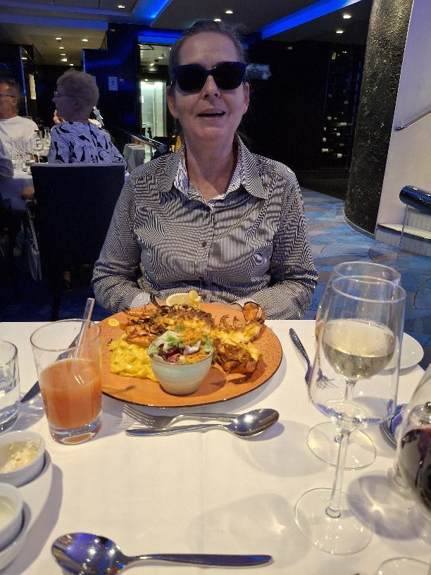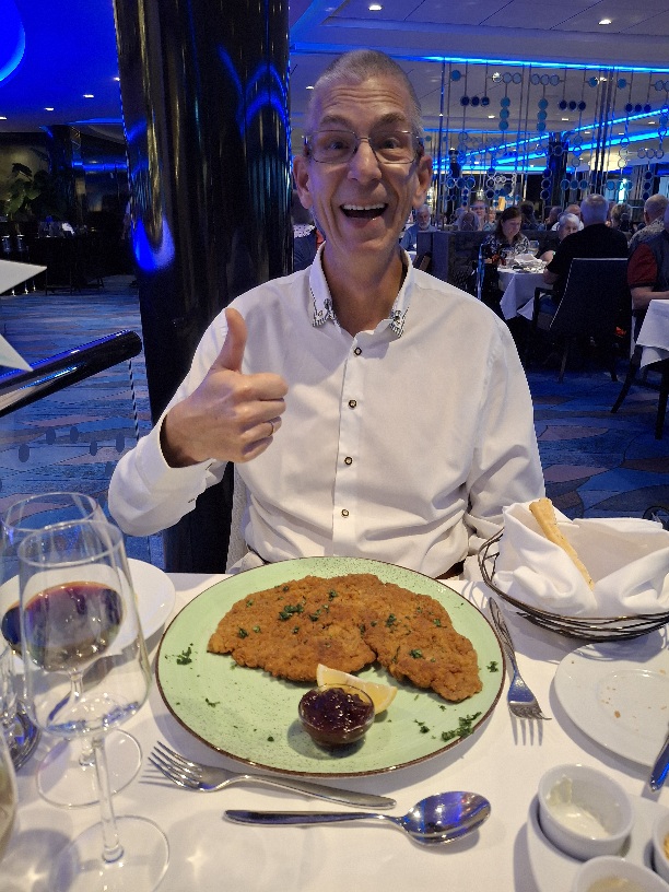 Vanavond waren we weer in de goede handen van onze vast ober Ernesto. En de wereld was weer goed. Het is Kerstavond, dus hebben we van de bijbetaal-kaart het hoofdgerecht uitgezocht. Koos had een supergrote Wienerschnitzel en Sylvia een hele gegratineerde kreeft. Koos helemaal blij en Sylvia beweert, dat dit de beste kreeft was, die ze op een cruiseschip heeft gegeten.