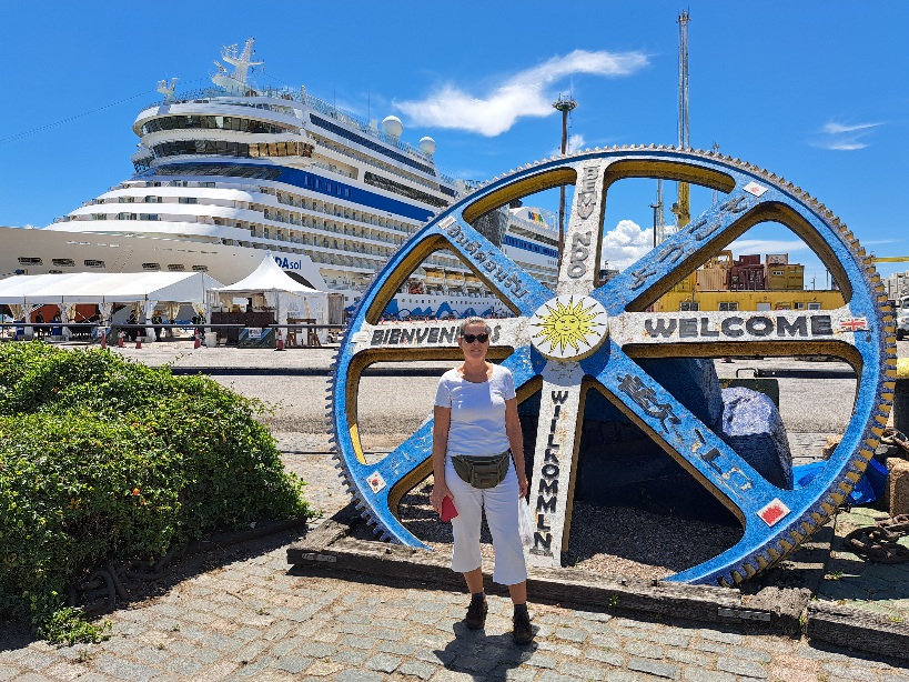 Tegen de avond meldt de kapitein zich via de intercom. Achter ons, in het zicht, vaart een Maersk containerschip uit Hamburg. Daarop staan 9 containers met voedsel voor ons schip. Die gaan in Buenos Aires gelost worden. Omdat het inklaren en laden op de AidaSol veeeeel tijd kost zullen we de Argentijnse hoofdstad een aantal uren later verlaten. Dus de liefhebbers kunnen 's avonds nog naar een aantal tango shows in de stad.